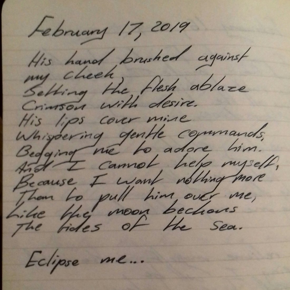 I remember, his hand on my knee as he whispered a bitter protest in my ear. Earnestly, he insisted that in another life he would have pushed me up against walls and induced tremors through the earth of my flesh by way of his tongue slicing through the jungle…